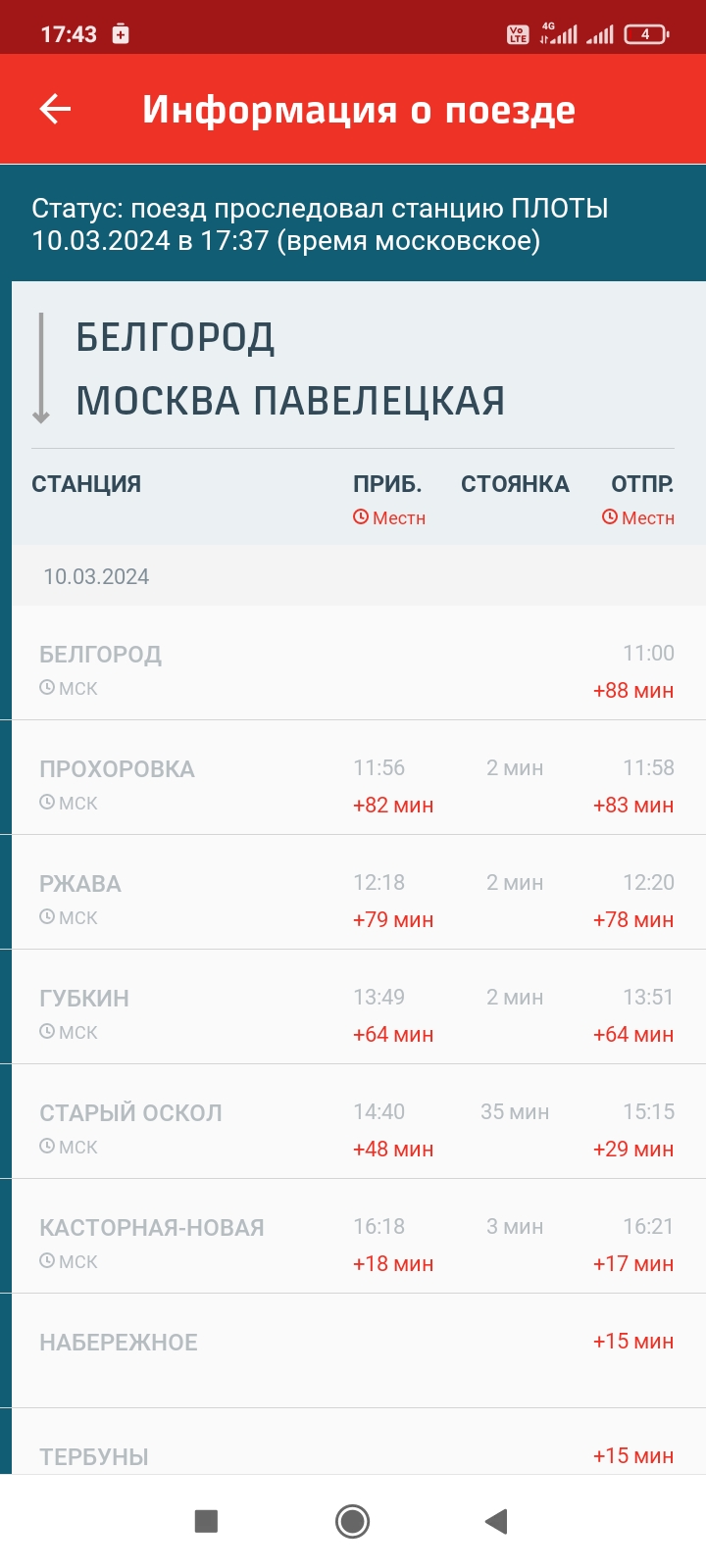 В приложении увидел, что мой поезд опаздывал на 88 минут от Белгорода, но к Улусарке было +14 всего.