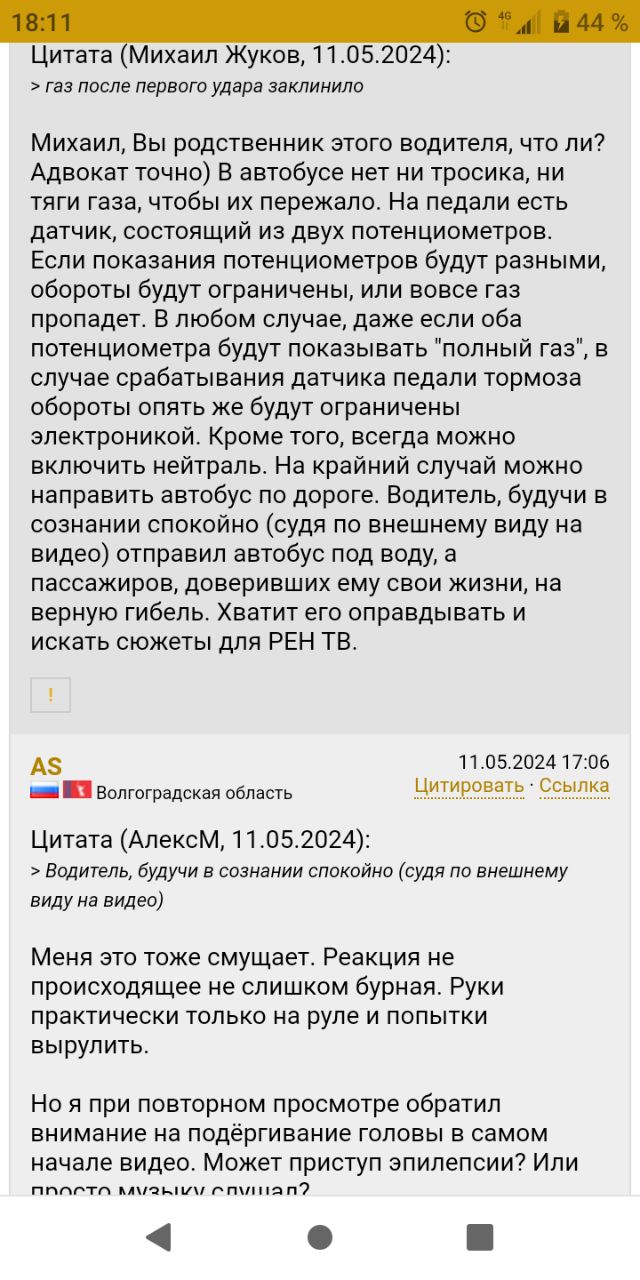 Вот именно, чего тут думать. Он осознанно упал с моста. Иначе, если бы его даже занесло, то после столкновения с каршерингом - остановился бы. Что и произошло бы, при пробитии колеса/сломе подвески, заклинивании руля. Но этого не было. Он планомерно совершил курбет на 180 градусов, с последующим утоплением. И по видео не видно, что он испуган. Так что - виноват, и сам отправил автобус под воду.