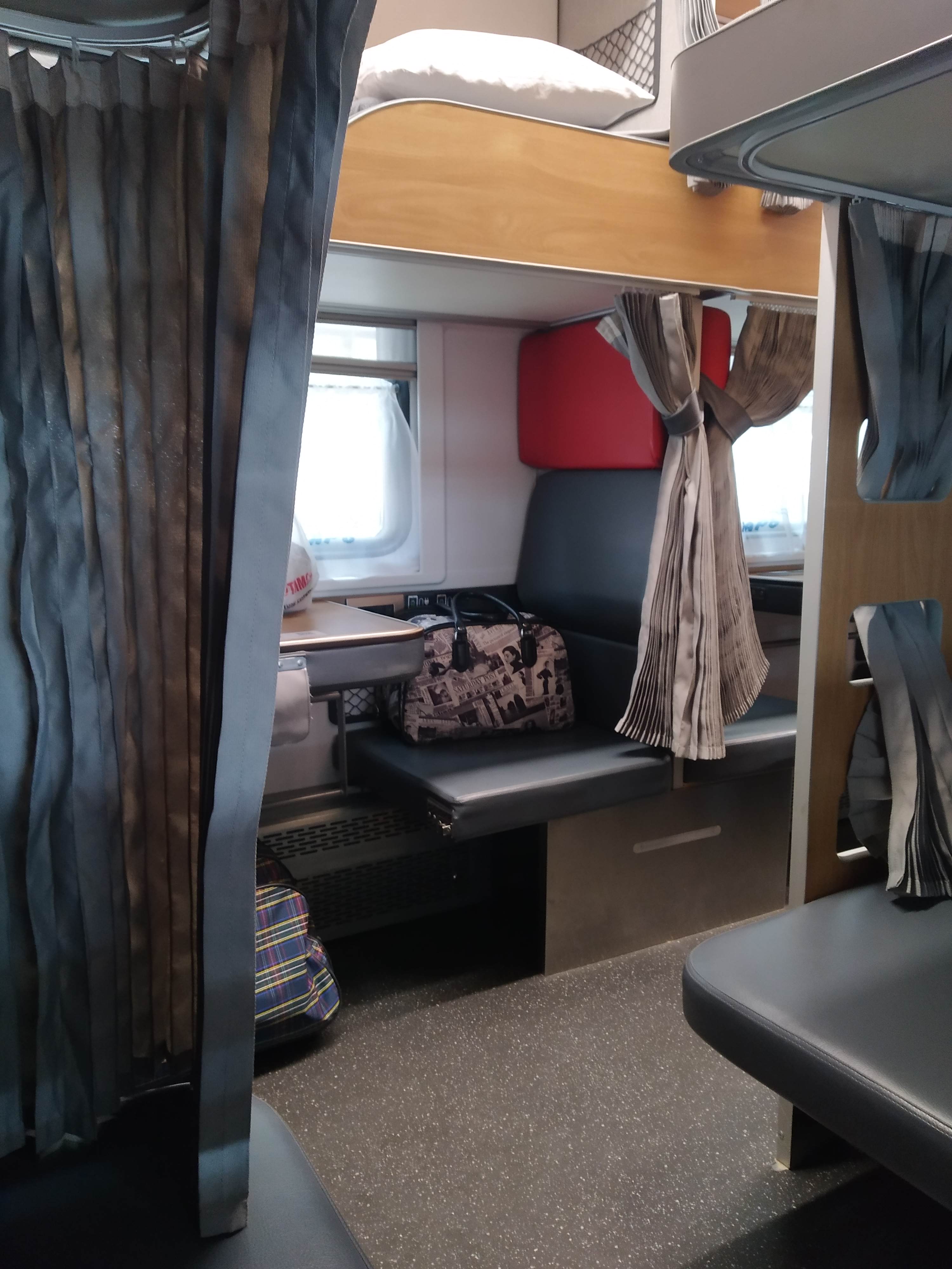 Вообще идея убрать третью полку над головой и продлить ее над коридором мне кажется наиболее здравой. И вещи будет куда положить, и сидеть можно будет на второй полке.