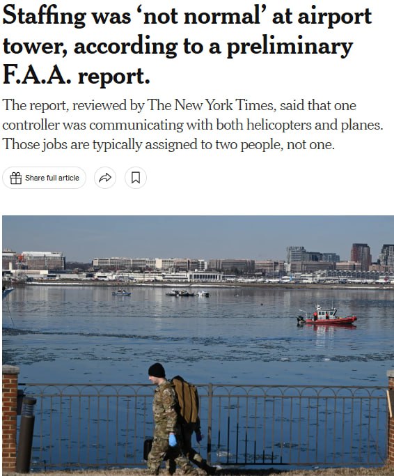 Диспетчерская смена на момент столкновения самолета с вертолетом в аэропорту Вашингтона имени Рональда Рейгана была неполной, а один специалист вел сразу несколько задач, включая координацию движения вертолетов и посадку самолетов.