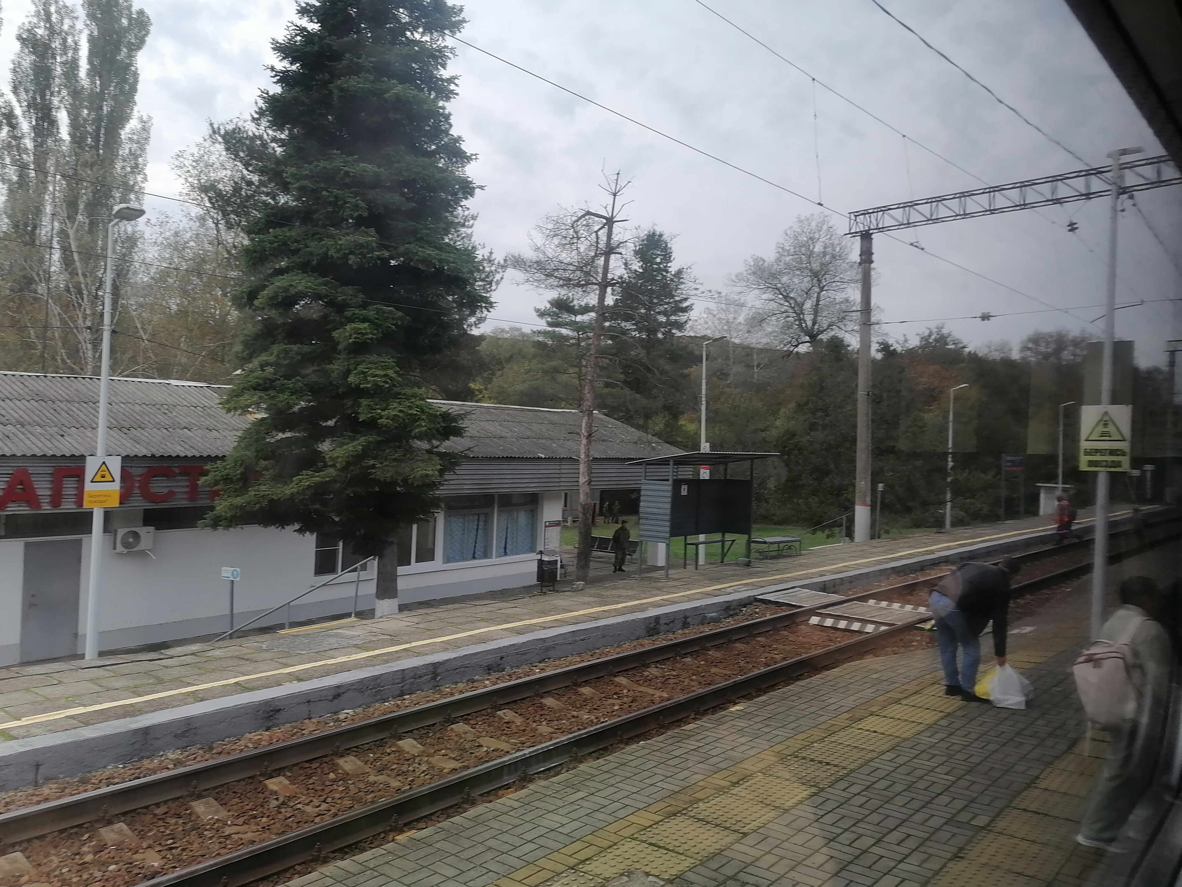 За 3 часа мы собрали 6.4 кг каштанов, в прошлом году привезли 5.3 кг. Идём обратно на станцию, прибыл товарняк со стороны Чинар, он пропускает электричку из Туапсе на Горячий. В 15:27 прибывает эля, садимся во второй вагон, находим свободный отсек и отправляемся в обратную дорогу. После тоннеля на о.п. Чайка и Калинка половина вагона вышла (тут дачи Туапсинцев).