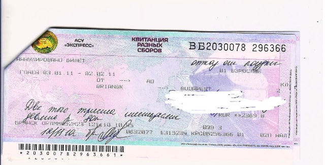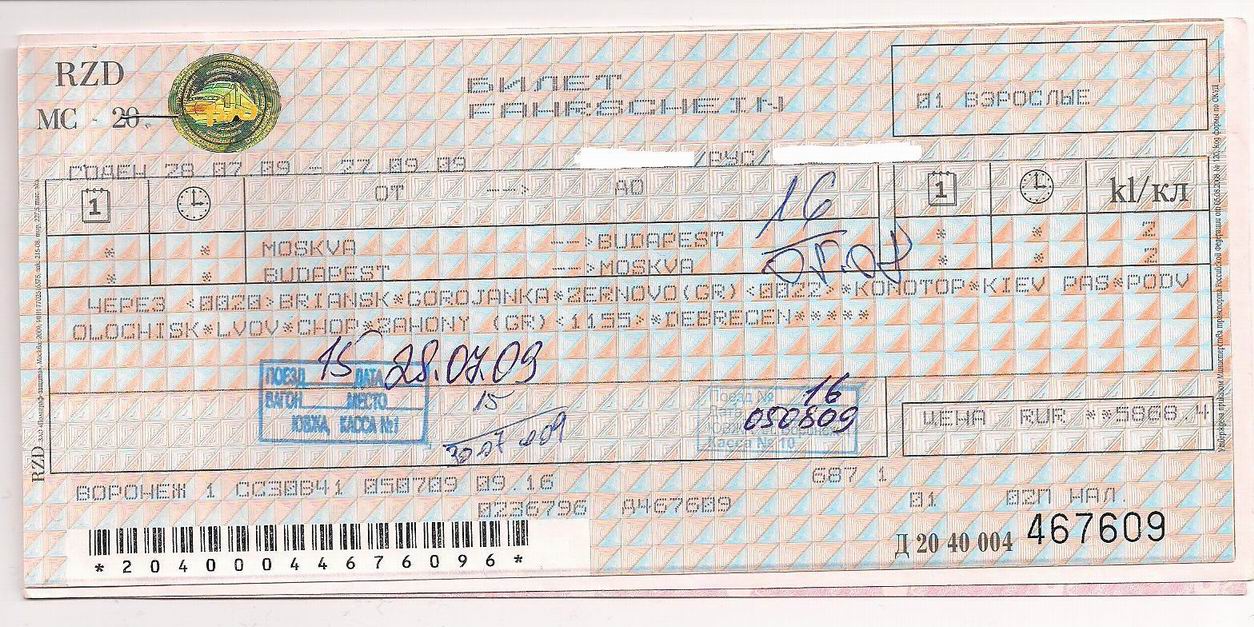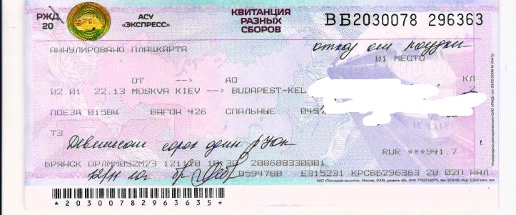 Нет, билет полный. Прикрепляю сканы. Но там только билет из Брянска до Будапешта, плацкарта из Москвы до Будапешта. Возврат по плацкарте на 116руб меньше, чем стоил билет (941+106=1047), билет вернули полностью. От Москвы до Будапешта билет стоил бы на 500руб дороже (по словам кассира).