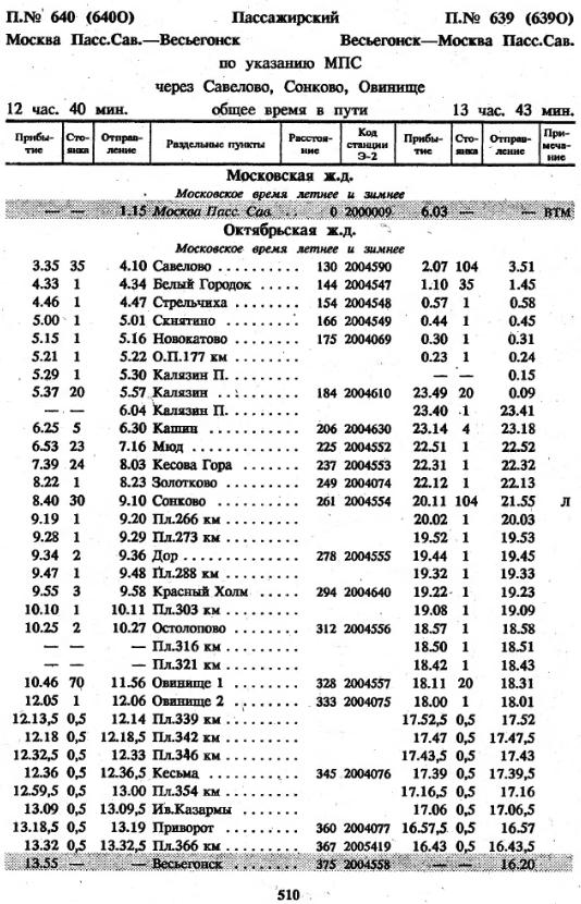 Указанный поезд М-Весьегонск ходил до 1996 года. В 1994 году был еще круглогодичным, ежедневным. В 1995 - летним через день. В 1996 - летним, по указанию МПС. Крайнее расписание 1996 года в приложении.